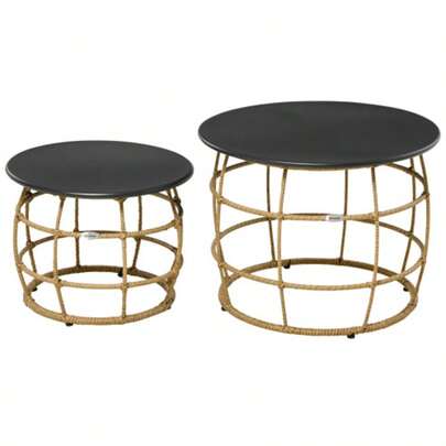 Set Of 2 Side Tables, Coffee Table, Hand-Woven With Tabletop For Garden Or Balcony, Ø46 Ø60 Cm, Sand - 黑色 - 查看 9