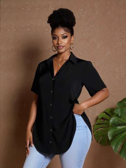 Maweii 大码女式夏季纯色短袖单排扣休闲衬衫 - 黑色 - 查看 1