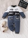 SHEIN Playful Pals 男婴户外时尚运动连体衣,白色、黑色和红色赛车印花