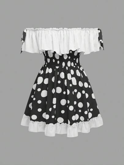 Sweetra 大码可爱迷人的蘑菇印花露肩迷你连衣裙 - 黑與白 - 查看 1