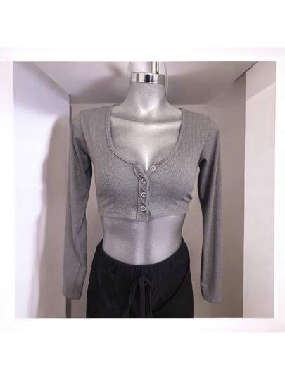 Sexy Crop Top Long Sleeve Button Down Blouse Womens Clothing - 灰色 - 查看 1