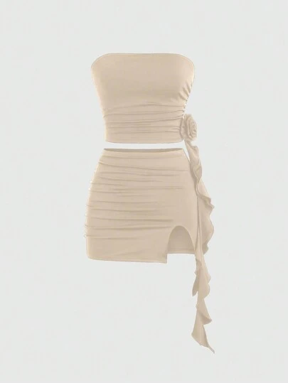 Sweetra 女士纯色 3D 花卉装饰褶皱抹胸和中长裙 2 件套服装 Y2K 服装 - 杏色 - 查看 3