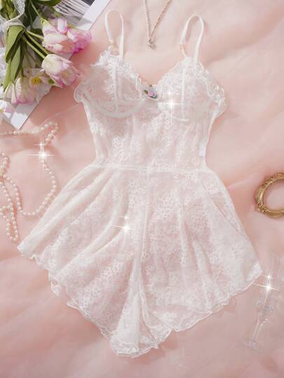 性感透明蕾丝边婚礼浪漫连体裤 - 白色 - 查看 1