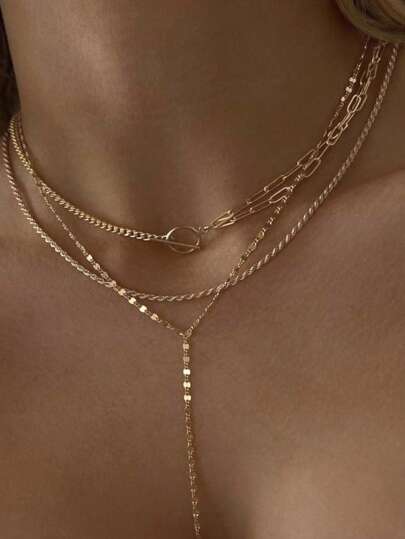 Shescity 3件套简约高端流苏Y型锁骨链项链套装(女士款) - 金黃色 - 查看 3