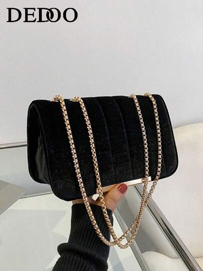 简约丝绒刺绣链条包 - 黑色 - 查看 1