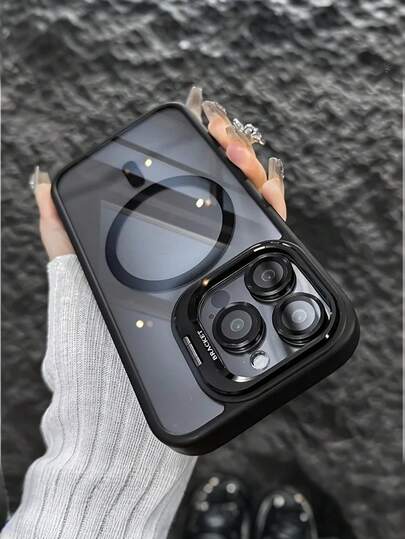 简约磁吸金属框镜头保护膜/支架三合一手机壳,适用于 17/17Pro/17Pro Max / 16/16Pro/16Pro Max/15/15Pro/15Pro Max/14/14Pro/14Pro Max/13/13Pro/13Pro Max/12/12Pro/12Pro Max/11/17 Pro Max,亚克力防摔硬壳保护套 - 黑色 - 查看 17