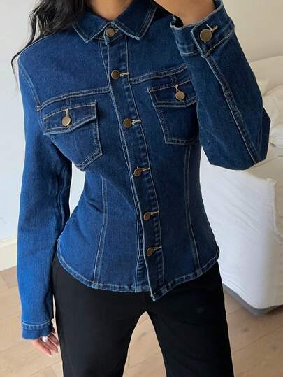 Siren Gaze 女士秋季长袖单排扣休闲口袋修身牛仔外套 - 深色水洗藍 - 查看 1