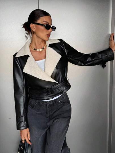 Siren Gaze 新款秋季女式休闲拼接仿毛领外套,休闲保暖 - 黑色 - 查看 6