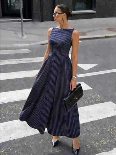 Siren Gaze 女士无袖条纹连衣裙,夏季通勤时尚之选 - 藍色 - 查看 7