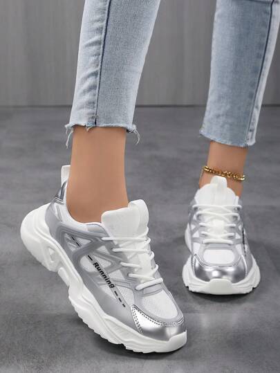 滑板鞋!女士休闲运动鞋,轻盈拼接设计,织带设计,轻盈透气,防滑耐磨,时尚百搭的休闲鞋 - 銀色 - 查看 1