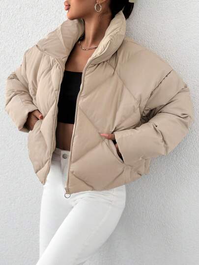 EURMUSE 斜口袋拉鏈開襟麵包服 - 米色 - 查看 3