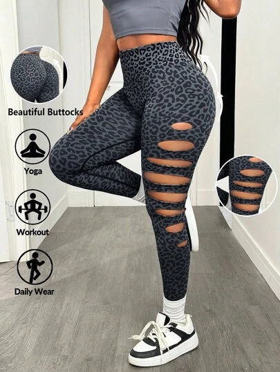 Slaydiva 1 件豹纹破洞七分跑步紧身裤