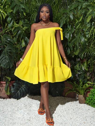 Slaydiva 夏季休閒度假單肩蝴蝶結A字褶邊寬鬆黃色短裙女裝 - 黃色 - 查看 1