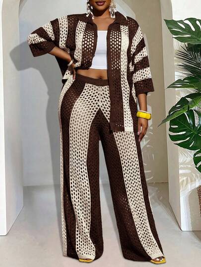 Slaydiva 新款春夏休闲简约镂空衬衫领长袖开衫+阔腿裤蓝绿色针织两件套 - 居家办公两件套女装羊毛两件套针织两件套