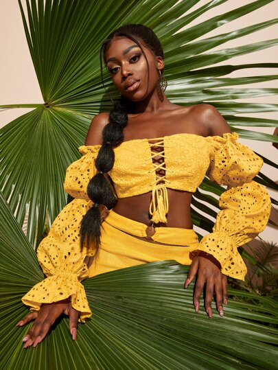 Slaydiva 一字肩網眼刺繡交叉繫帶短款襯衫 - 黃色 - 查看 1