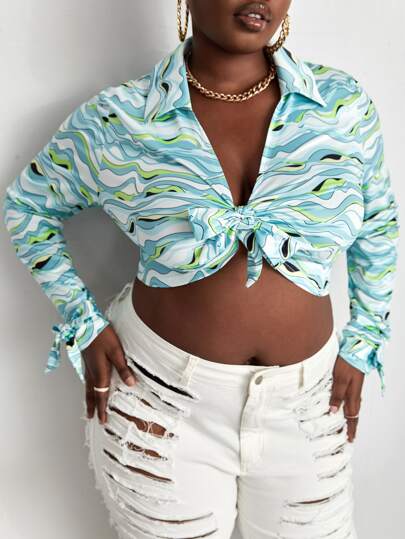 Slaydiva 大碼滿版印花前打結短款上衣 - 彩色 - 查看 1
