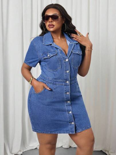 Slaydiva 大码休闲水洗前扣牛仔连衣裙 - 藍色 - 查看 1