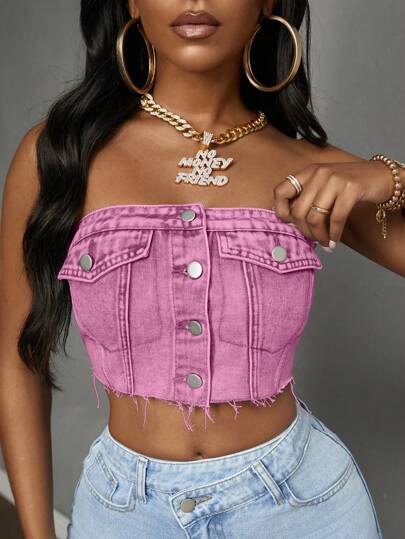 Slaydiva 夏季街头时尚前扣磨边短款上衣 - 粉色 - 查看 2