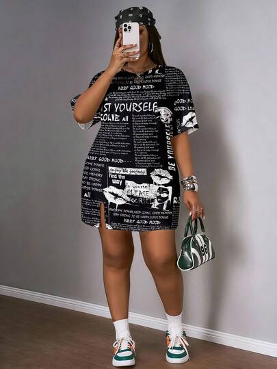 Slaydiva 复古海报印花大码连衣裙,适合音乐节穿着。