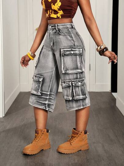 Slaydiva 女士休闲工装七分牛仔裤,带口袋,适合日常穿着