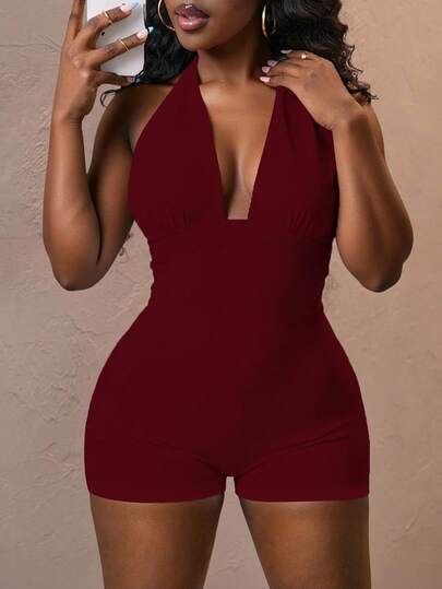 Slaydiva 女士休闲性感胸部褶皱露背吊带连体裤 - 酒紅色 - 查看 1
