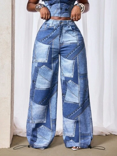 Slaydiva 女式休闲水洗抽绳下摆阔腿牛仔裤 - 藍色 - 查看 1