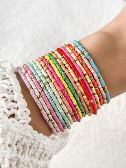 18 件彩色玻璃珠弹力手链,波西米亚风格手工串珠手链,女士(CCB 种子珠,颜色随机) - 彩色 - 查看 1