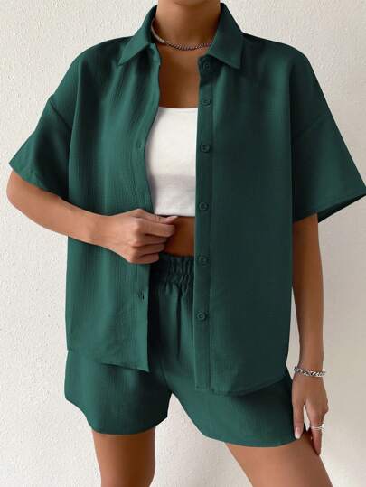 SHEIN Unity 休闲纯色短袖衬衫和短裤套装 - 墨綠色 - 查看 1