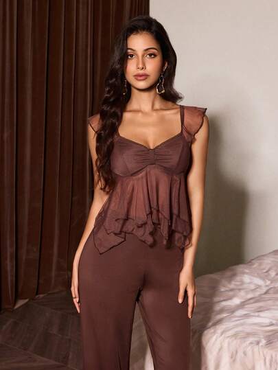 Slumberist 女士性感透视双层网纱不对称下摆上衣和裤子睡衣套装