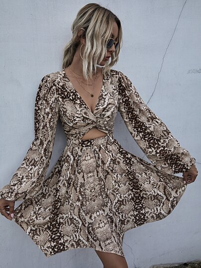 蛇紋鏤空前扭結燈籠袖連衣裙 - 彩色 - 查看 1