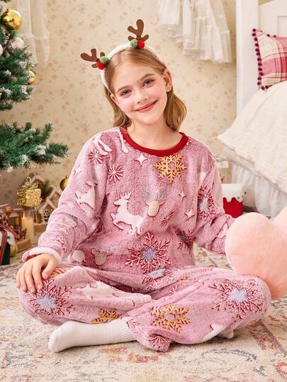 Snug Zone 圣诞雪花和驯鹿夜光珊瑚绒长袖和裤子可爱大女孩睡衣套装 - 紅色 - 查看 1
