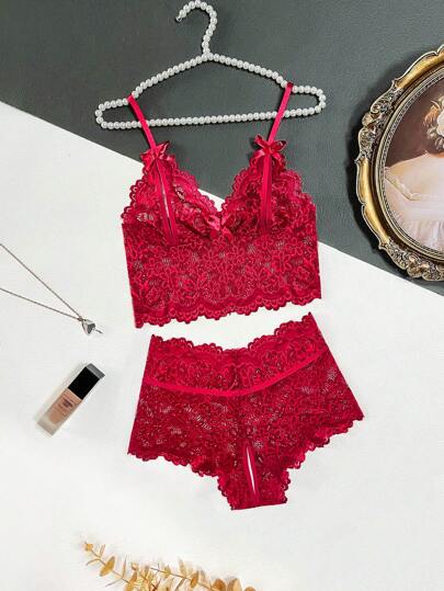 Snug Zone 花卉蕾絲貝殼邊內衣套裝 - 酒紅色 - 查看 1