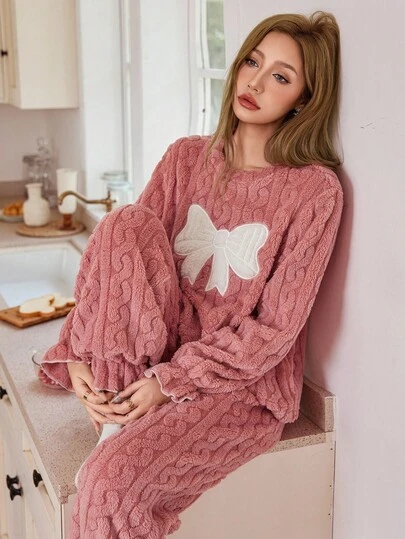 Snug Zone 女士提花抓绒拼接蝴蝶结长袖上衣和裤子毛绒柔软舒适蓬松睡衣套装,秋冬服装 - 粉色 - 查看 1