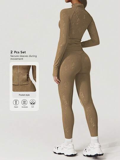 Sodalemon 女士全拉链口袋拇指孔健身夹克无缝前缝瑜伽紧身裤银色烫印运动套装 - 摩卡棕 - 查看 1