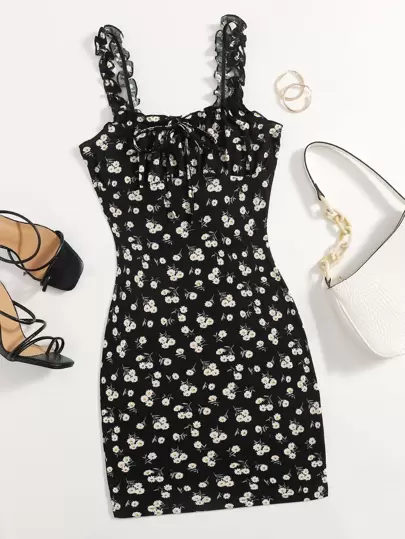 Soleia 木耳邊帶繫帶抽褶胸小雛菊花卉連衣裙 - 黑色 - 查看 1