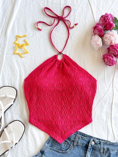 Soleia 纹理钩编系带前吊带露背上衣,度假装 - 玫紅色 - 查看 1