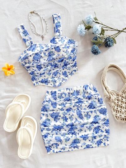 Soleia 女士粉色碎花修身背心和迷你裙两件套,海岛度假装 - 藍白色 - 查看 1