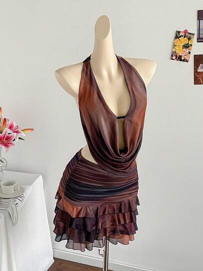 Soleia 女式性感扎染印花露背打结荷叶边下摆迷你连衣裙,夏季 - 彩色 - 查看 1