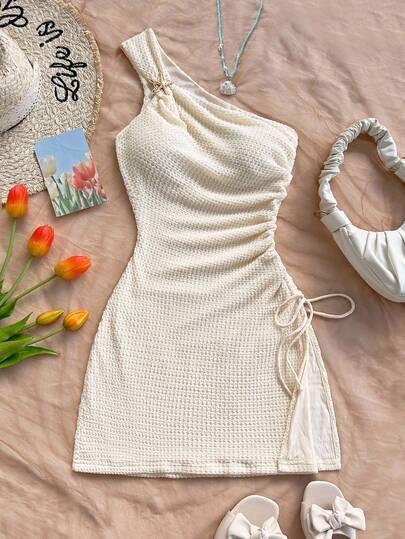 Soleia 女士度假连衣裙,性感优雅的度假连衣裙,杏色针织纹理面料,单肩金属海星装饰,褶饰蝴蝶结,修身中长连衣裙,适合派对、约会、情人节、性感修身、时尚、西部、邮轮、度假、下午茶、海滩、邮轮、海岛度假、城市度假、音乐节、波西米亚度假,百搭内外穿,四季皆宜 - 米色 - 查看 7