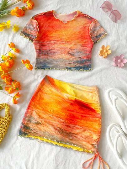 Soleia WYWH 女士度假风格橙色扎染日落印花网眼短款上衣和迷你裙两件套,适合海滩、度假村、音乐节、夏季 - 彩色 - 查看 1