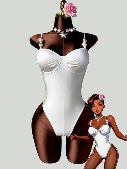 纯色休闲可爱优雅性感镂空面料沙滩/晚宴泳衣,适合所有季节 - 米色 - 查看 1