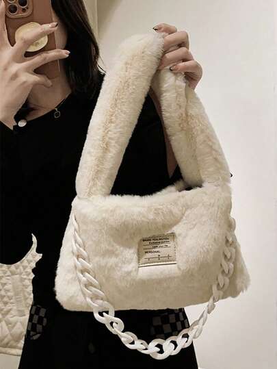 纯色毛绒单肩包,链条装饰,时尚风格 - 彩色 - 查看 6