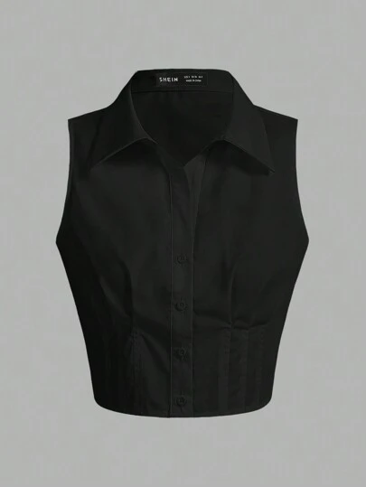 SHEIN EZwear 純色無袖襯衫 - 黑色 - 查看 1