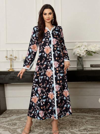 Al Najma 纯色拼接缺口领长袖朴素连衣裙,休闲日常穿着 - 黑色 - 查看 1