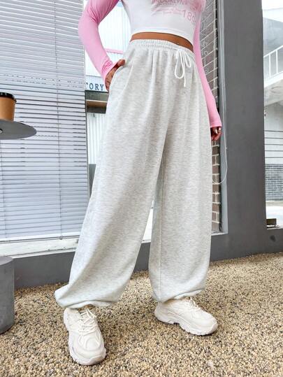 Flirla 素色腰部抽繩斜口袋衛褲 - 淺灰色 - 查看 1