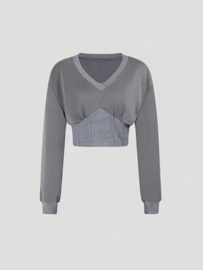 SHEIN Unity 素色落肩袖短款運動衫 - 灰色 - 查看 1