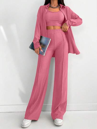 EURMUSE 3 件套女式纯色长袖衬衫、裤子和背心套装 - 藕粉色 - 查看 1