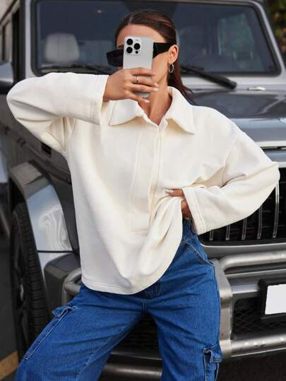 EURMUSE 素色落肩袖運動衫 - 白色 - 查看 2