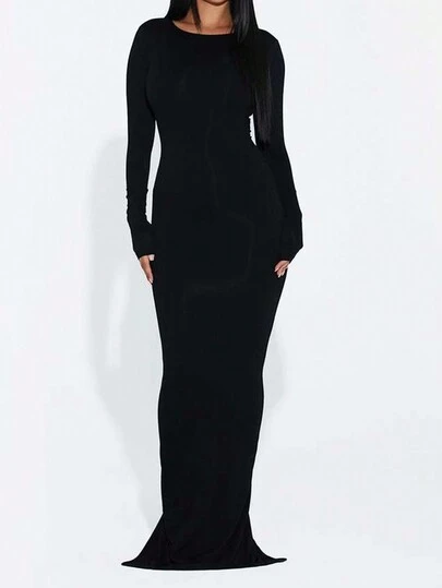 純色長袖及地連身裙 2024 春季新年派對連身裙