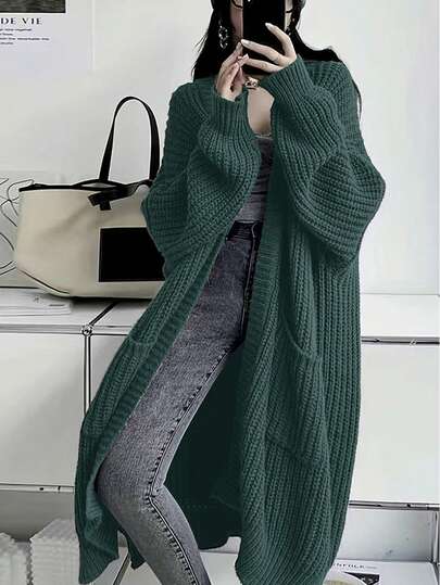 纯色前开宽松针织开衫,休闲长袖长款带口袋毛衣,女士服装 - 墨綠色 - 查看 1